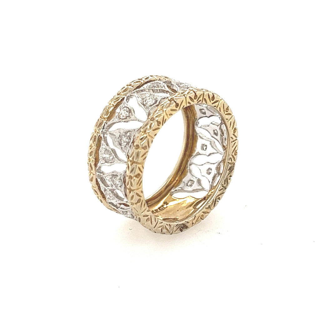 This two-tone ring is crafted from 14-karat gold, it has diamonds set into triangles with a total approximate weight of 0.30 carats. We love how the ring display in two tone colors with dedicate details which makes it a very unique ring