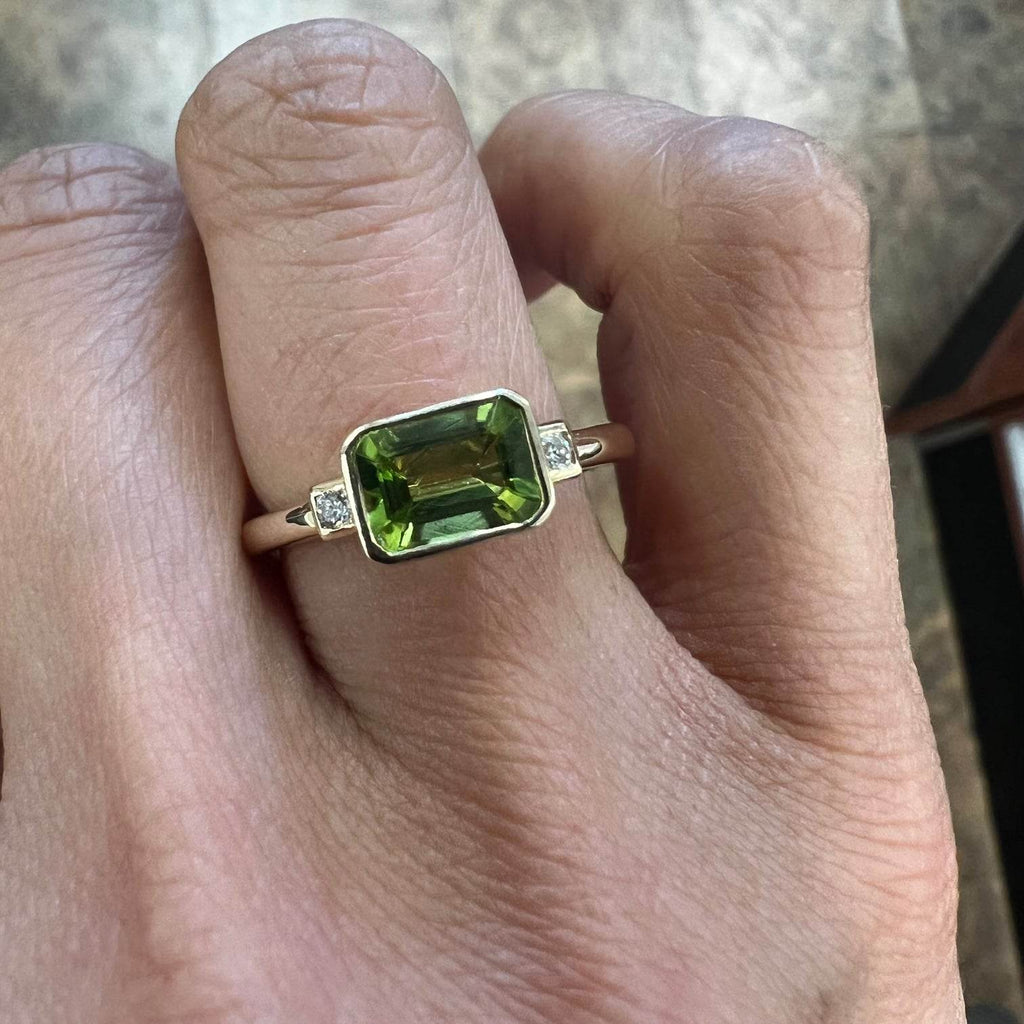 We believe that jewelry should elevate your outfit and mood, and this peridot minimal ring will do just that. It features a vibrant rectangular green peridot framed with two tiny diamonds that are faceted to catch the light from all angles and has a polished 14-karat gold band. Stack it with other vibrant pieces to channel the more-is-more vibe.