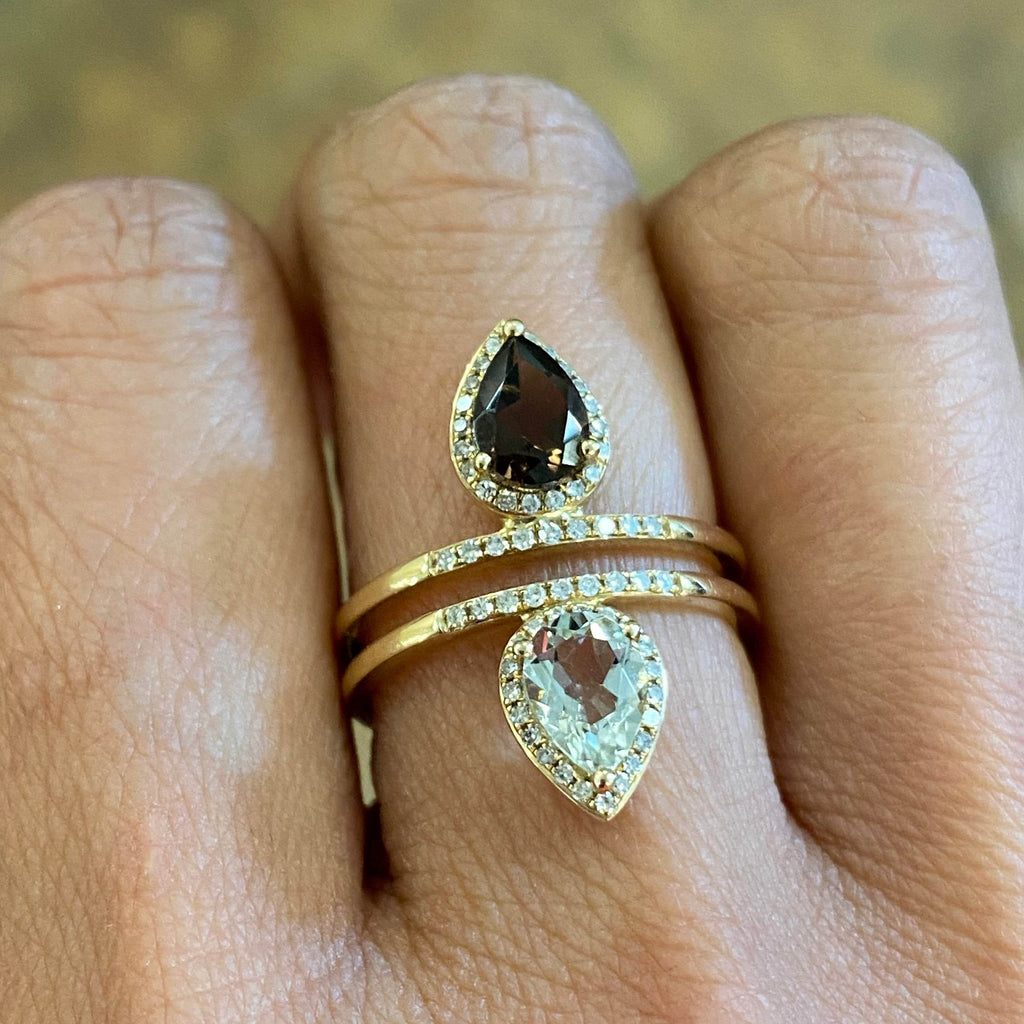A truly beautiful and timeless ring. It's well made from 14-karat gold, it has pear-faceted cut smoky topaz and green amethyst stone in prong sets that are accented by small and glittering brilliant cut diamonds. The neutral hues look especially pretty against a classic red manicure.